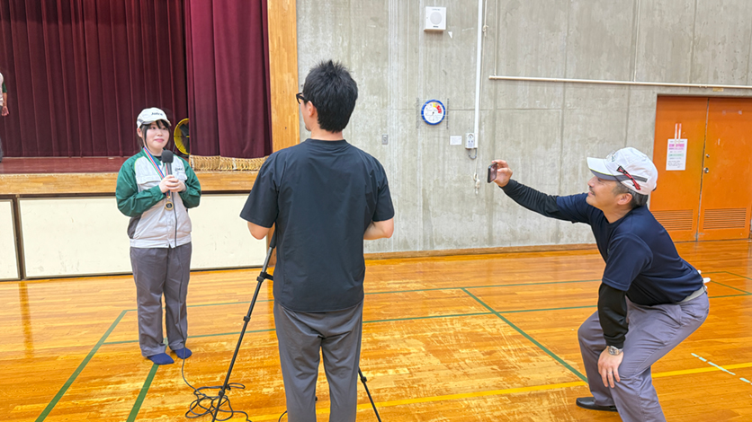 優勝インタビューを受ける朝比奈さんを嬉しそうに撮影する望月係長