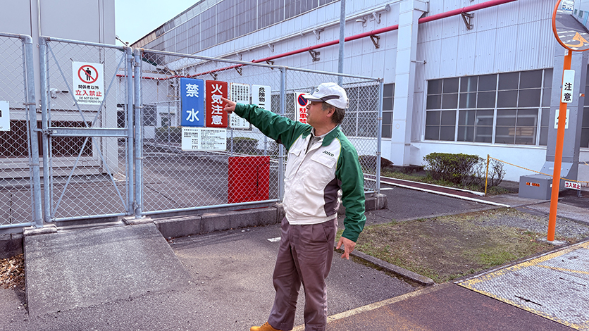 今回、全社の自然災害BCMの取りまとめ役をされている工務部工務課川口さんに工場敷地内を案内していただきました。