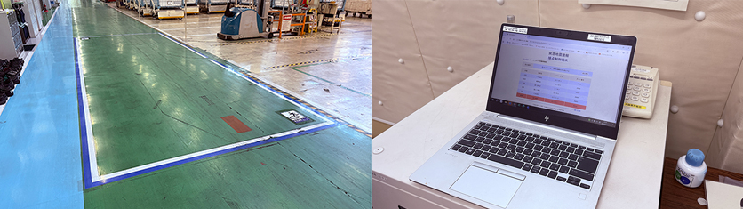 工場を歩いていると至る所に緊急避難ゾーンを見つけることができました。 緊急地震速報システムと連携されているPC