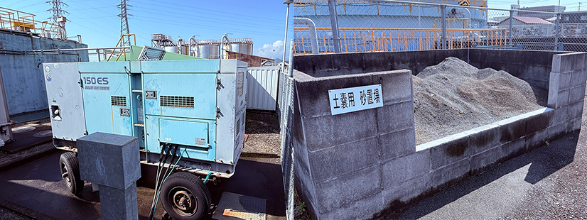 移動式発電機と土嚢用砂場